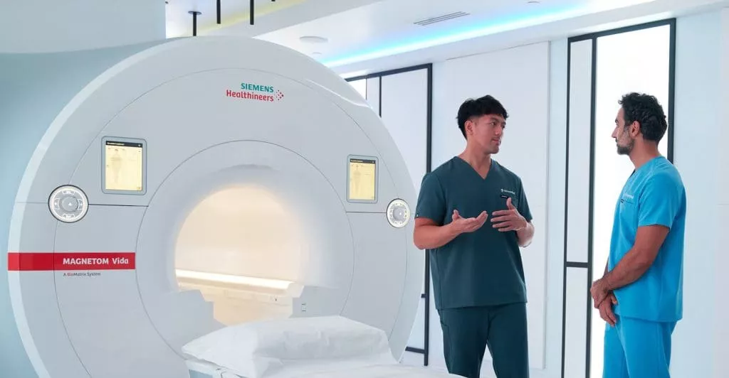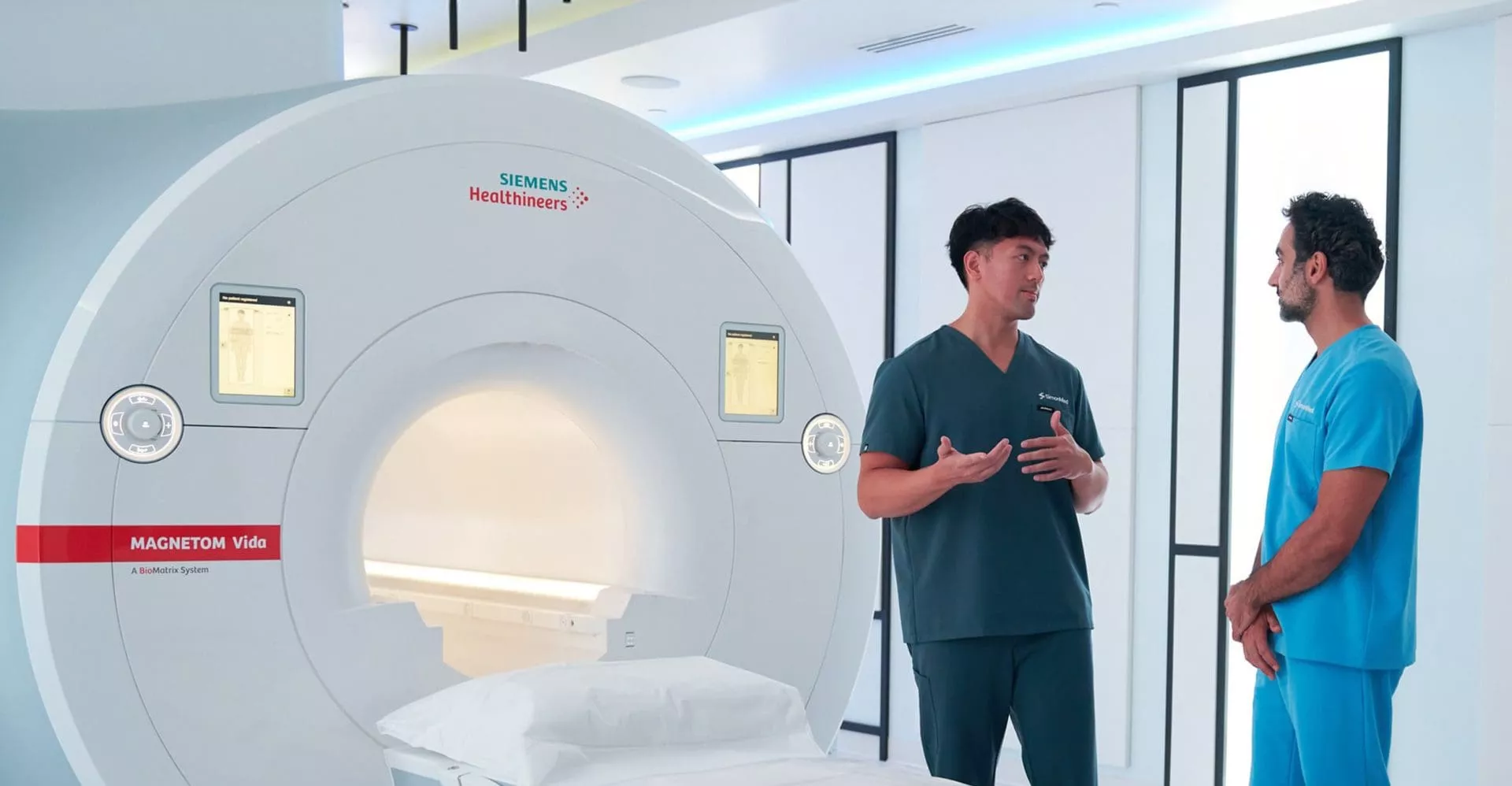 Two clinicians talking beside a Siemens MRI scanner in a modern imaging suite.