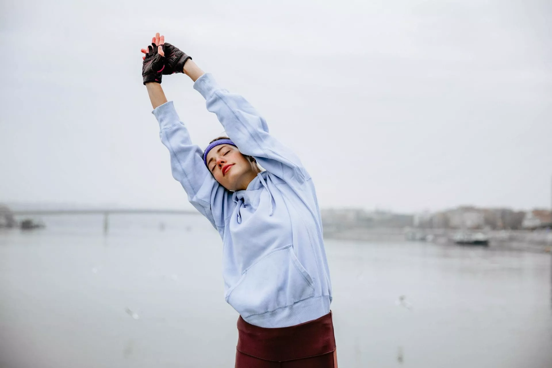 Person stretching with arms raised overhead by the water, wearing a hoodie and gloves.