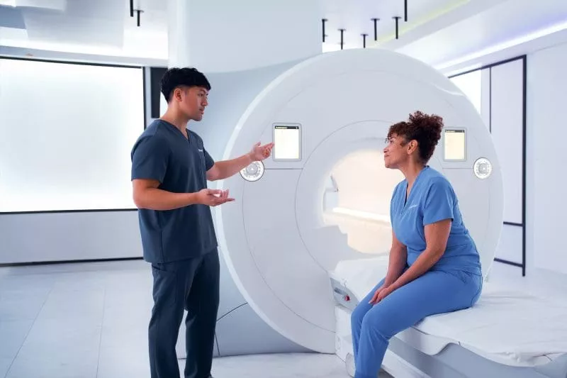 A clinician explains an MRI scan to a patient seated on the scan table beside the machine.
